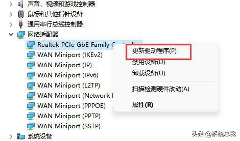3、然后进行网络电源适配器,寻找无线网口机器设备,右键选中,点一下“升级驱动程序”