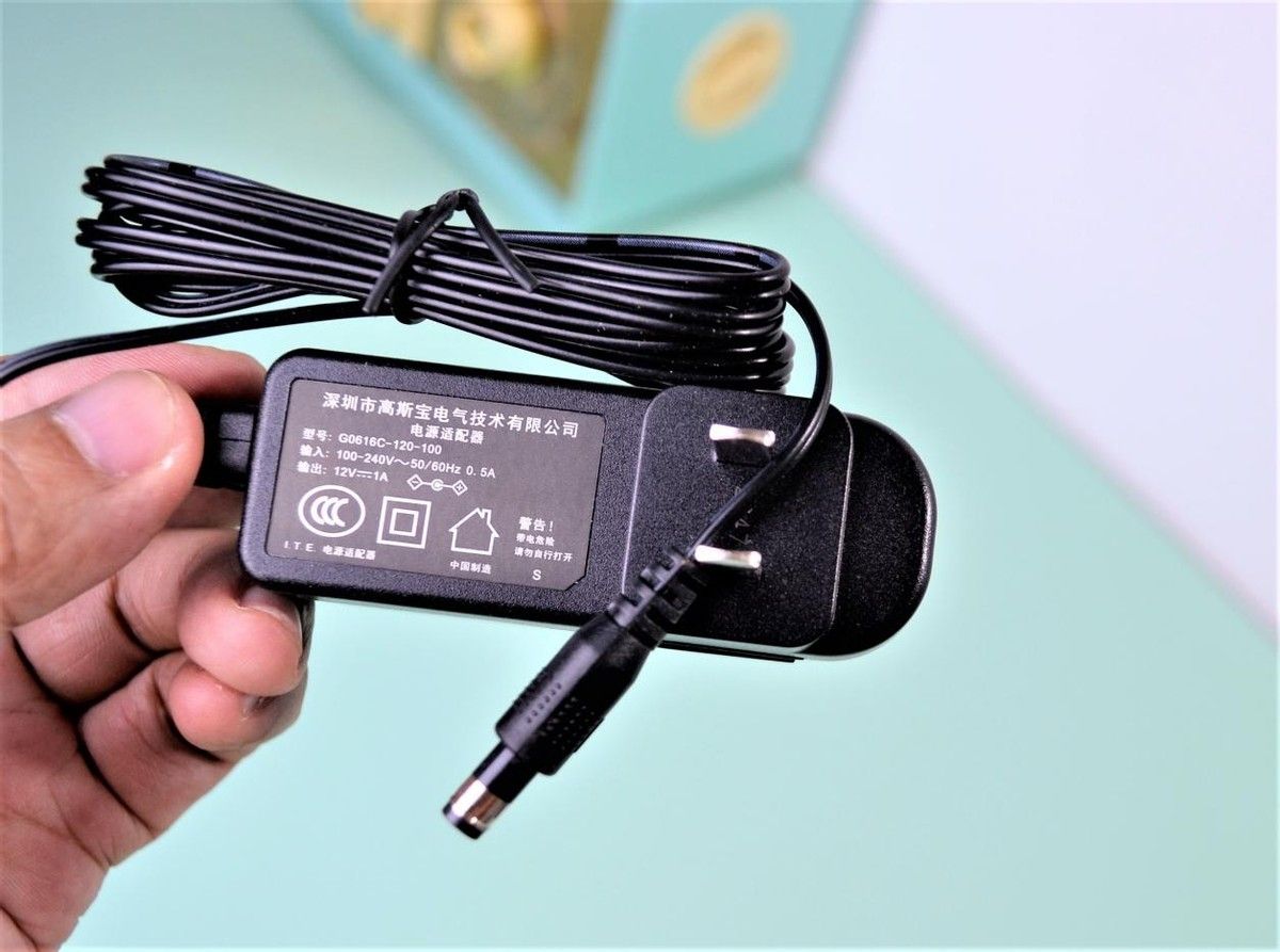电源适配线上印有型号、输入电流以及警告事项等信息。主机背面的标签印有路由器的型号、管理地址以及默认密码。