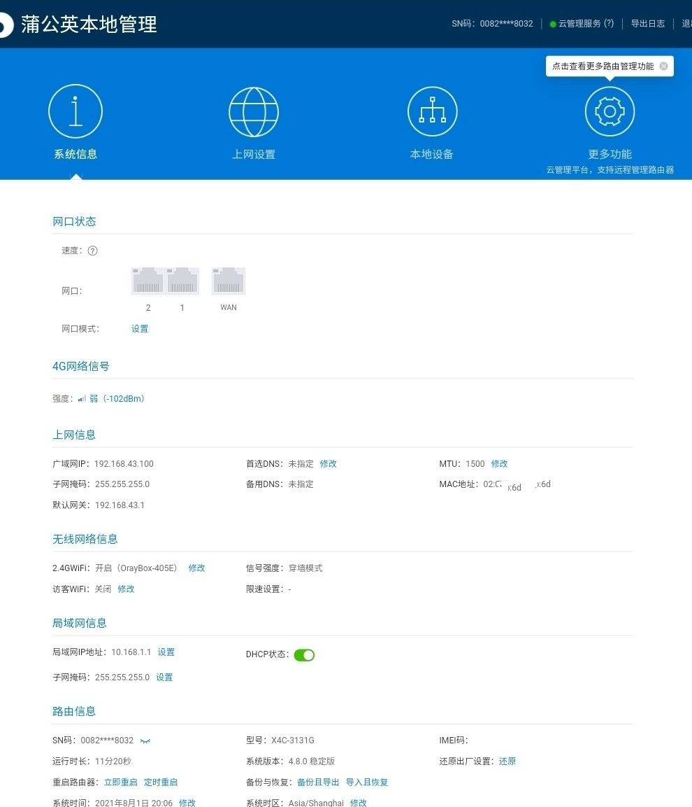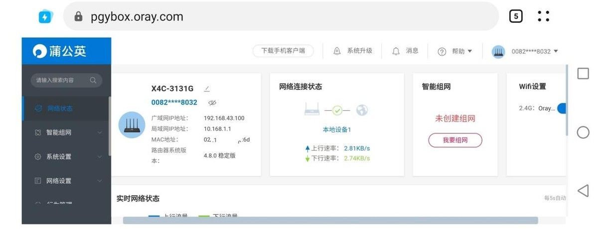 WiFi账号设置完毕之后,笔者通过手机连接重新连接OrayBox开头的WiFi,输入自己设置的密码即可上网冲浪。进入路由器后台可以看到系统信息。