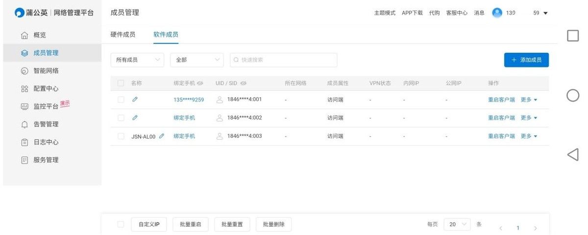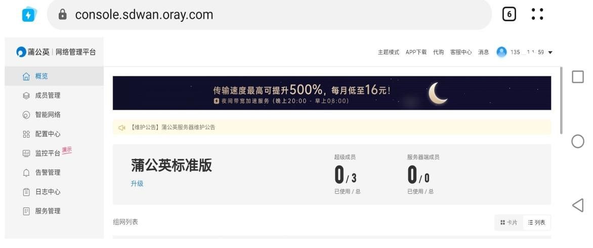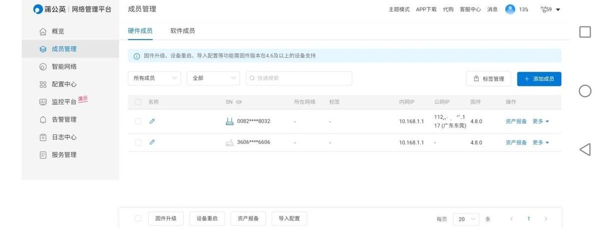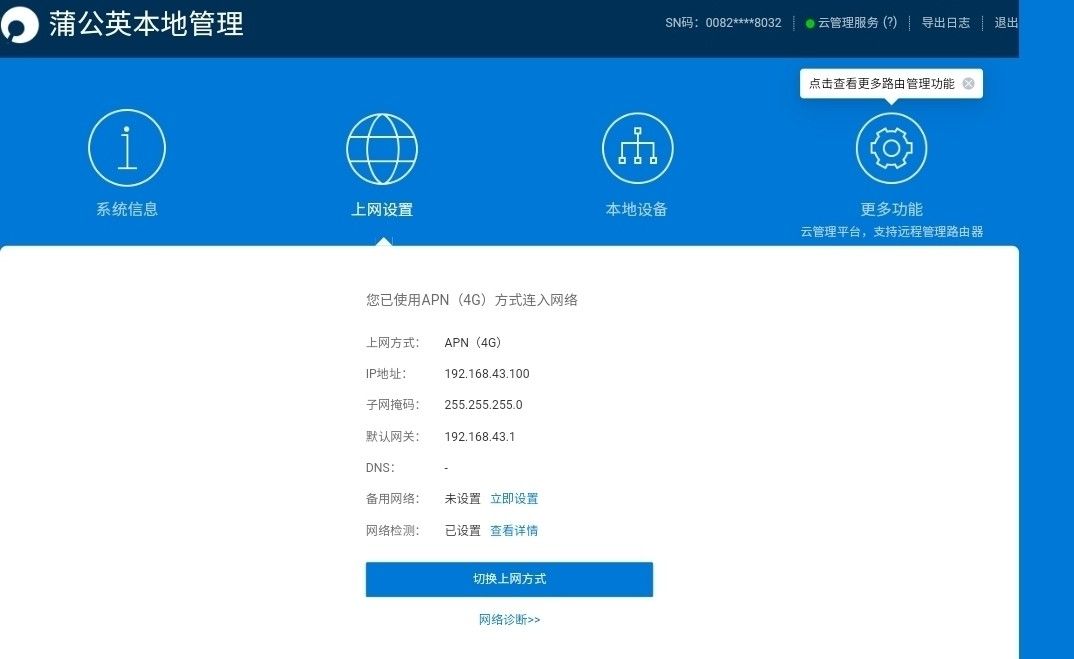 蒲公英X4C路由器的另一大功能就是智能组网,组网之后,就可以免公网IP访问远程资源,设置组网的步骤比较简单,根据提示点击后台界面的智能组网,就可以切换到网络管理平台。