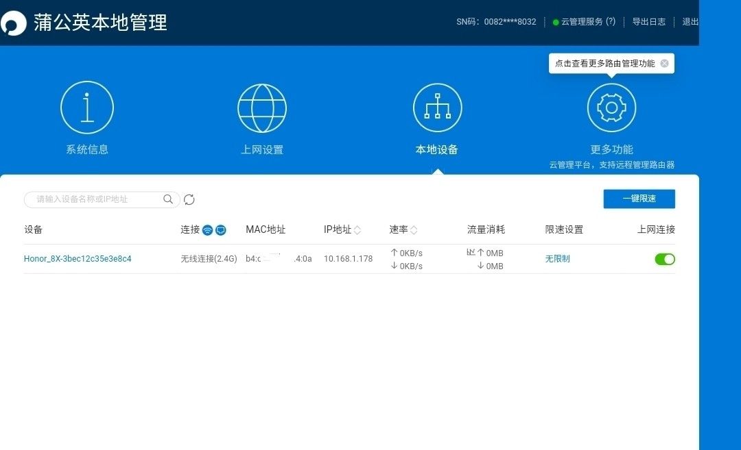 进入菜单本地设备,可以看到连接到本地的设备,可以进行限速设置及上网连接开关。