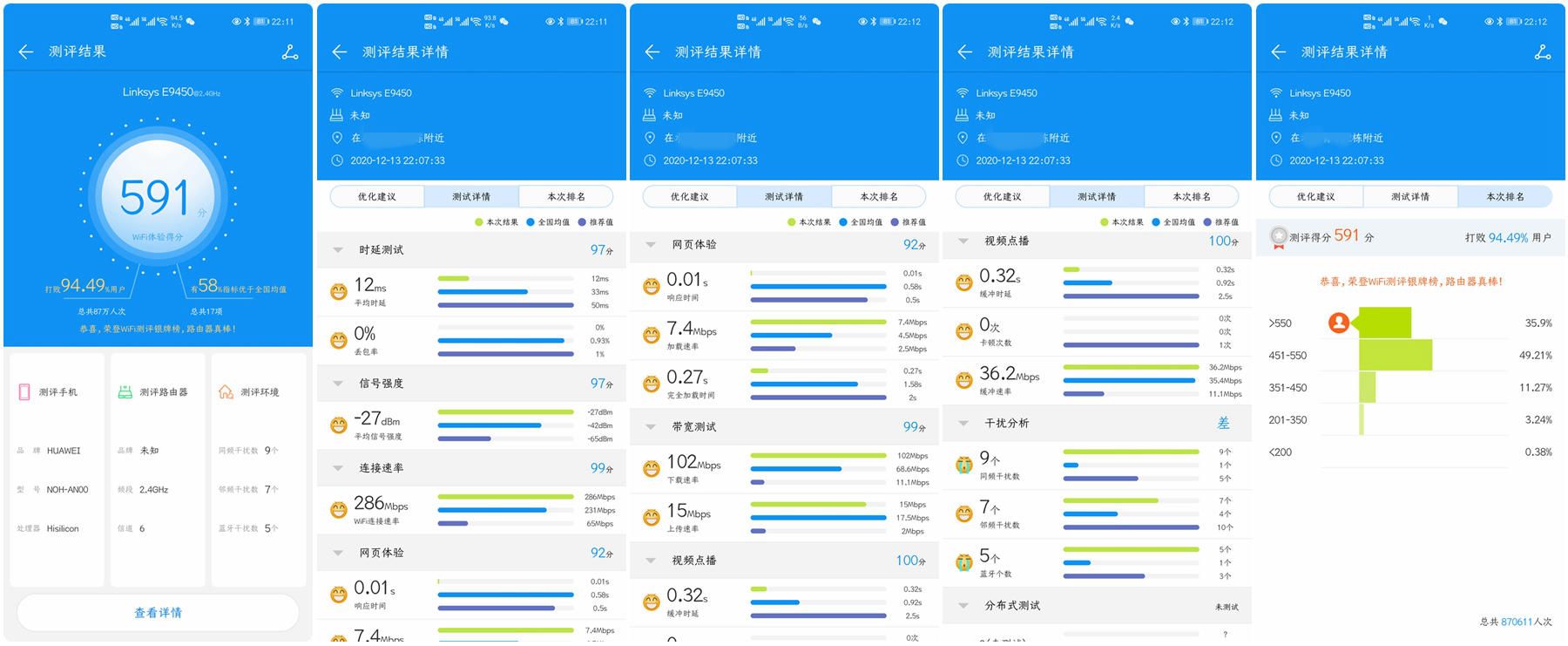 接下来是实际测试的部分,用WiFi评测大师进行了一下测试,分数是目前测试过的路由器里面最高的一个,达到了591分。即便是抛开网络的部分,信号强度,响应时间也都比之前测试过的路由器要强。