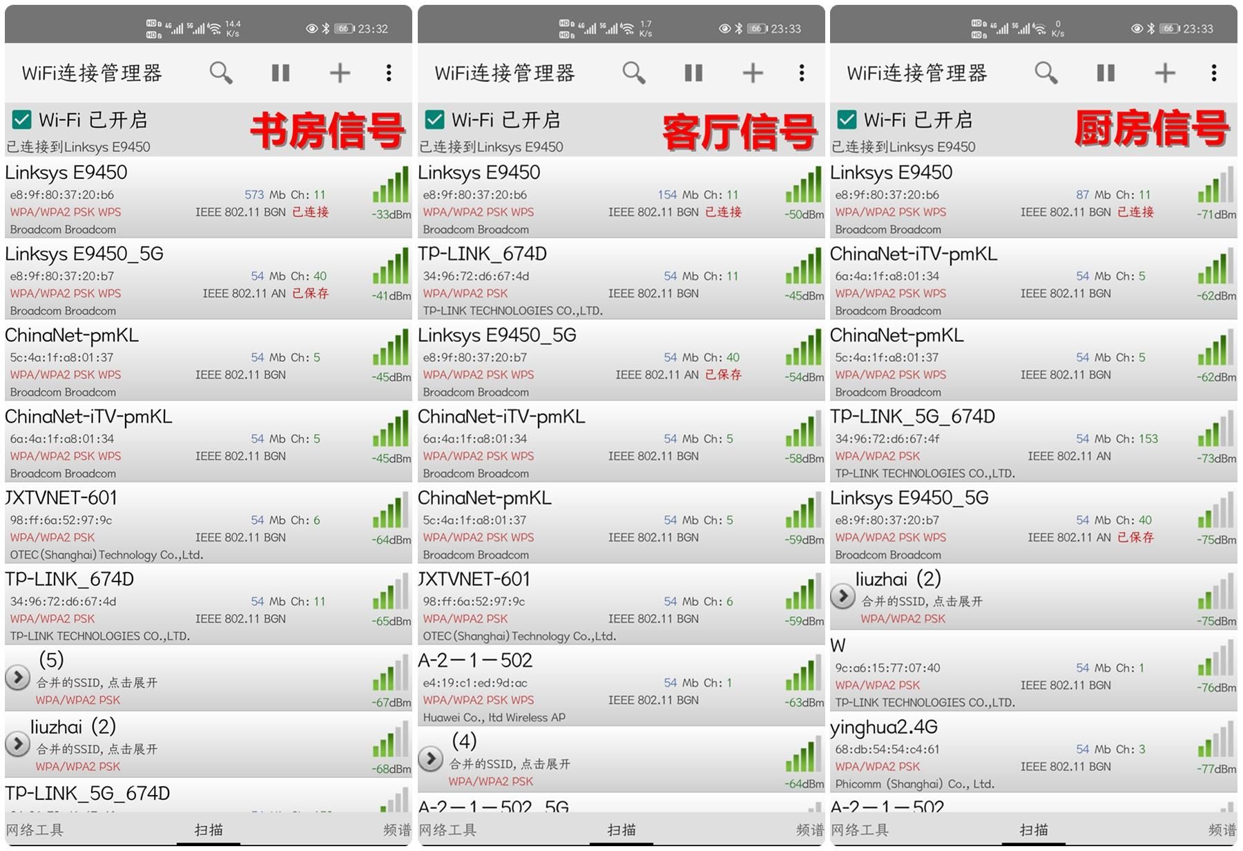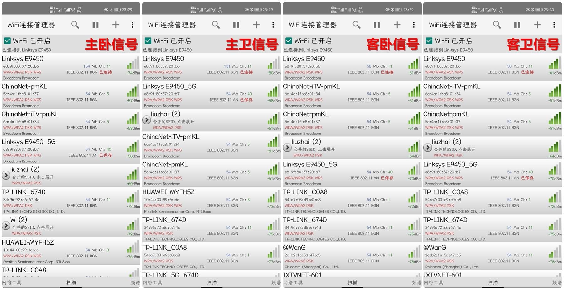 在主卧和主卫里面,LINKSYS E9450在5G频段下的WiFi信号居然没有太大的差距,信号强度都在-57dm到-80dm之间。一般情况下,卫生间里的信号都是要差一些的。没想到LINKSYS E9450在主卧和主卫里的信号只是稍微有些差异。可能这也和遮挡不多有点缘故。