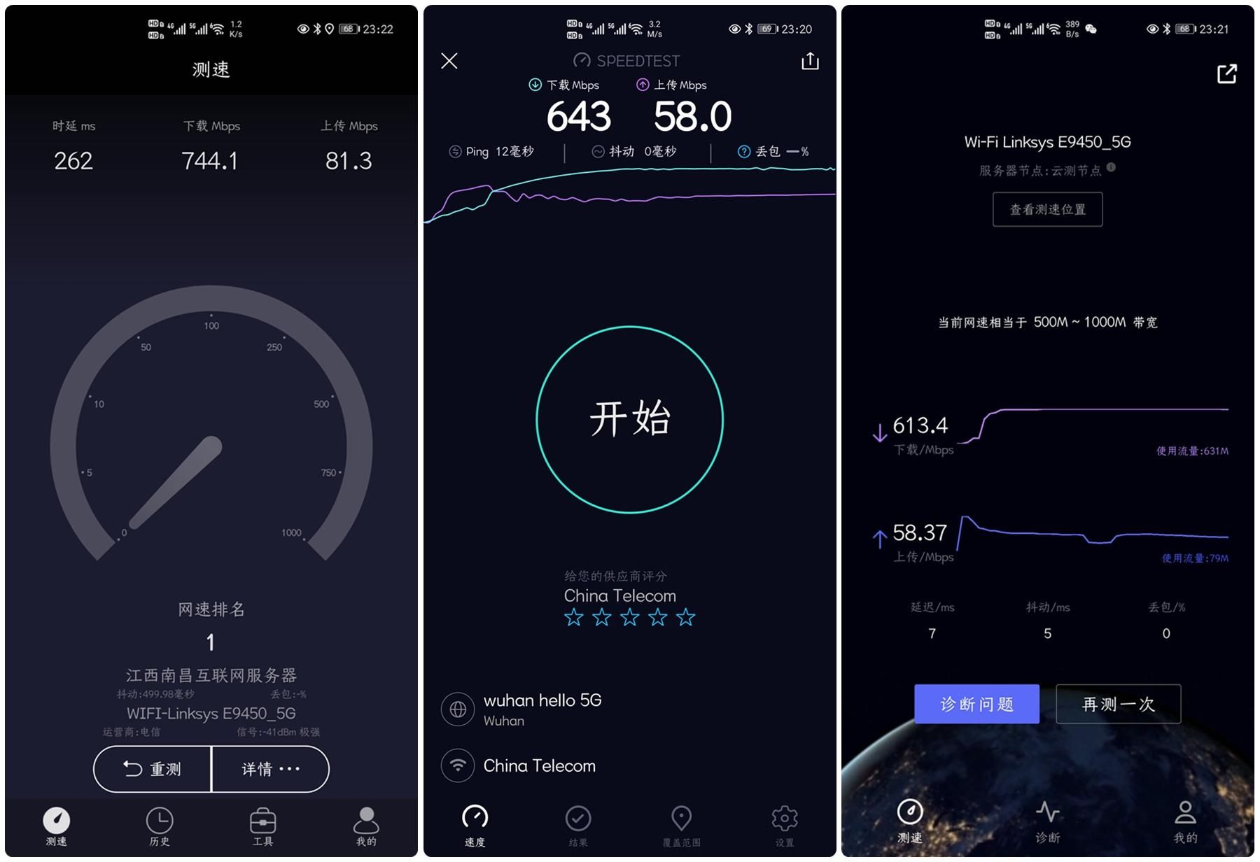 用speedtest,华为的一键测速,测速网三个软件试了下,家里的500M宽带居然跑出了600多M的速度,而且延迟也都不差。