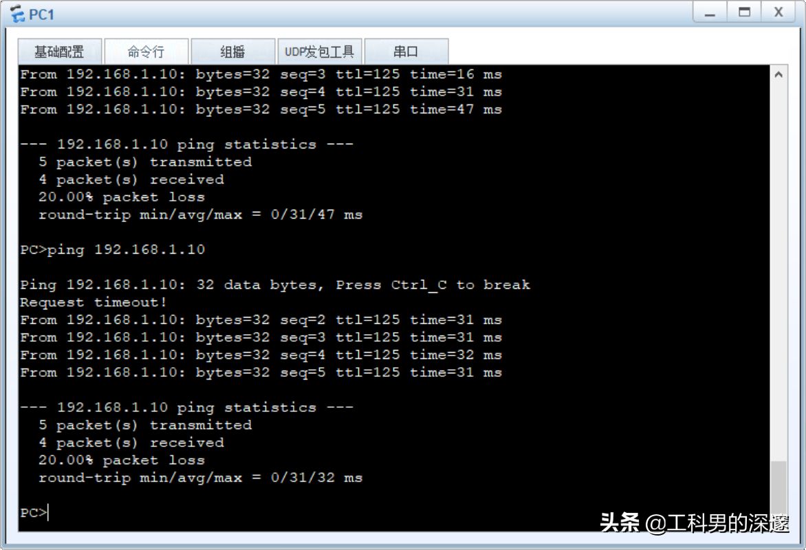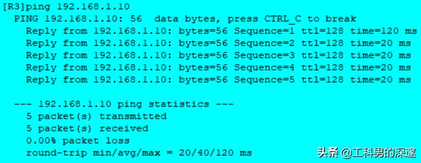 第一次PING,前面有丢包的现象,那是因为,路由器要有一个学习ARP的过程。