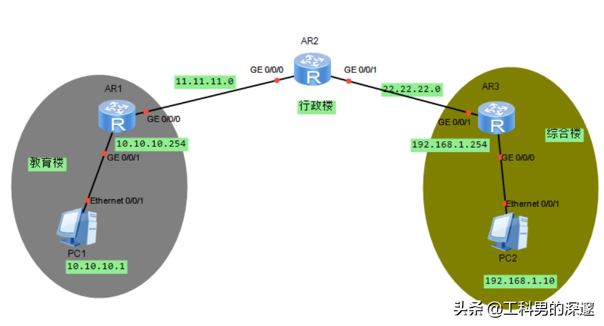 下面配置教育楼的PC1与综合楼的PC2互通的静态路由;