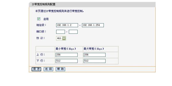 下行带宽: 通过WAN口允许的最大下载速度限制和最小下载速度保证,最大带宽为0时表示采用下行总带宽。