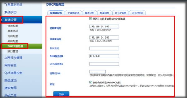 - 点击【基础设置】——【DHCP服务器】——【服务器配置】