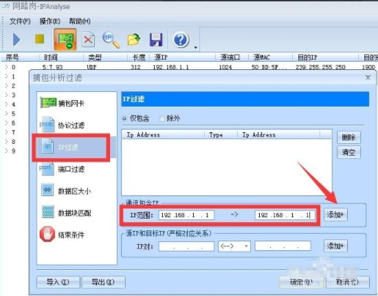 在程序主界面中,点击“包过滤”按钮,并从打开的窗口中,切换到“IP过滤”选项卡,在“通讯包含IP”栏目中,输入路由器的IP地址,点击“添加”按钮,并点击“确定”保存设置。