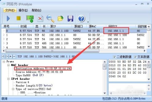待捕捉到数据包后,在“IPAnalyse”找到“目地IP”地址为路由器IP的数据包点击选中,此时就可以在左下角窗口中找到“Destination Address”(目标地址)项,对应的数据值就是路由器MAC地址。