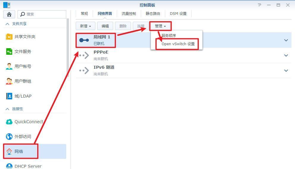 硬件上开启虚拟机功能后,还需要在群晖系统内开启,进入群晖系统——控制面板——网络——选中“局域网”——点击“管理”,在下拉菜单中选择“Open vSwitch 设置”