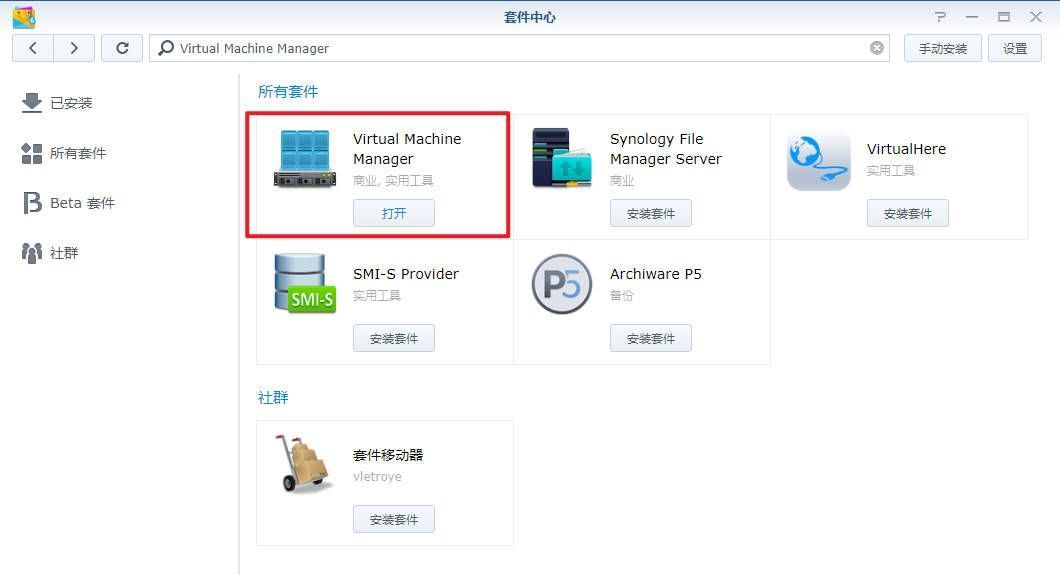 VMM是虚拟机程序Virtual Machine Manager的简称,群晖套件中心就有,打开套件中心,搜索Virtual Machine Manager,第一个就是,点击安装