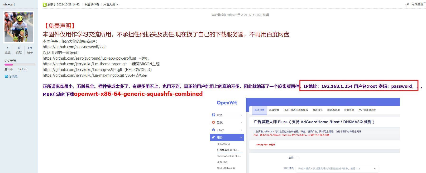 注意:在固件发布页面发布者一般会注明系统管理页面地址以及登录的用户名和密码,一定要记住,不然无法进入管理页面了。