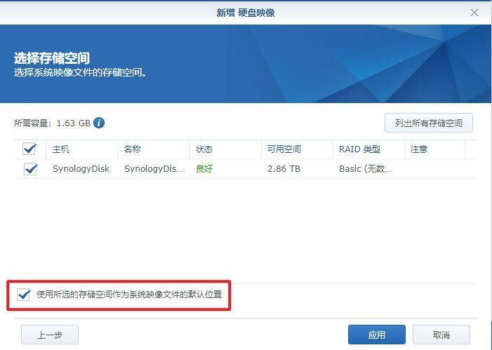 点击下一步,勾选“使用所选的存储空间作为系统映像文件的默认位置”,点击应用,等待安装