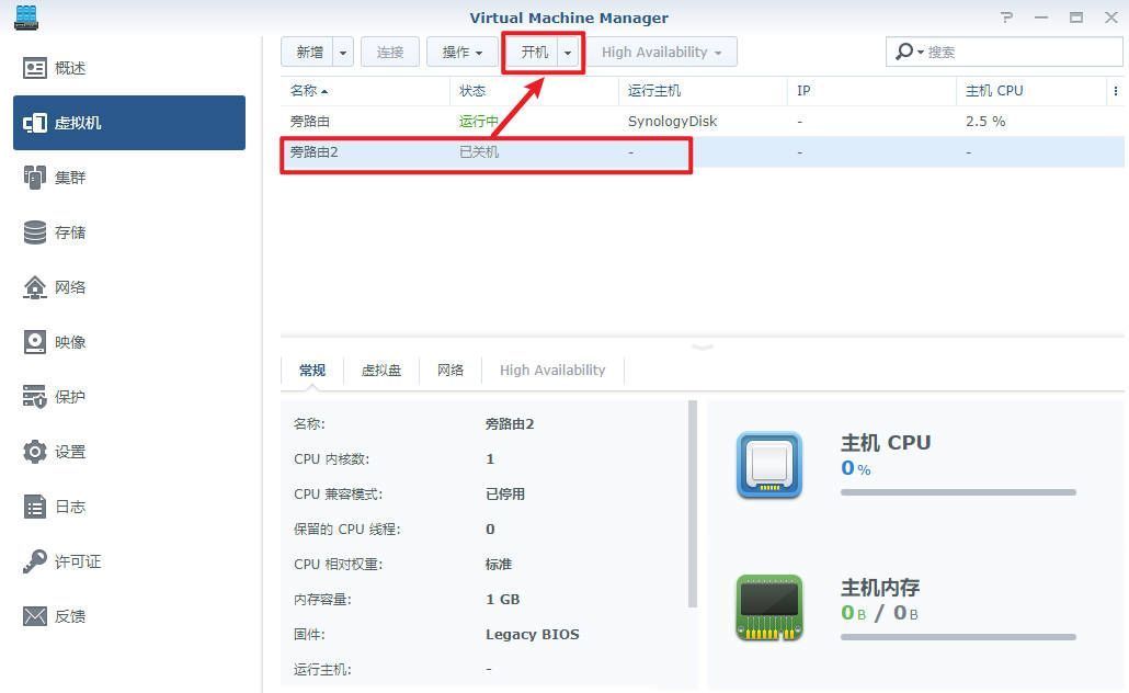 创建完成,选中刚刚创建号的软路由,点击“开机”