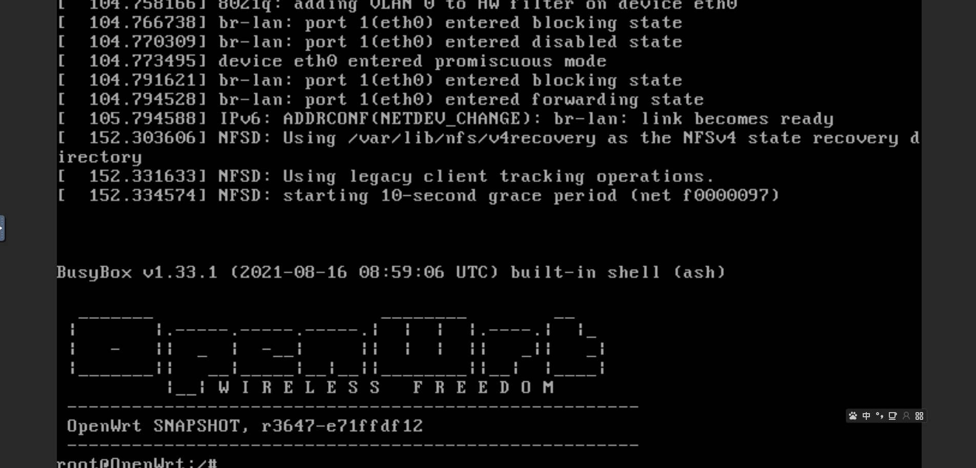 这个时候回到了原始点命令行界面,输入reboot,回车,软路由系统就会重启
