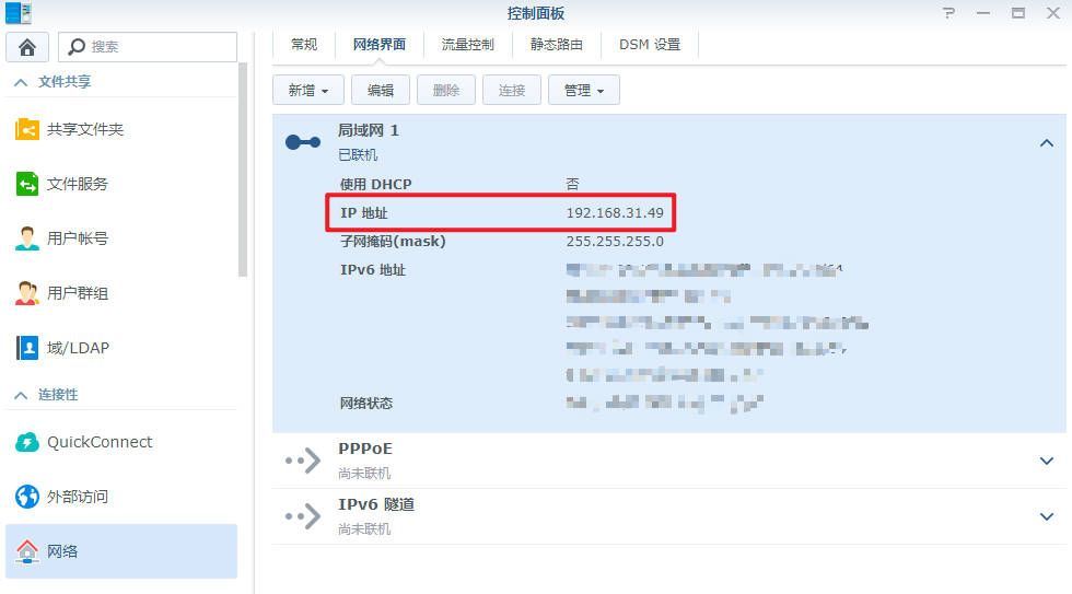 ②查看当前局域网的网段,最简单的方法是进入群晖系统——控制面板——网络——点击局域网下拉,例如我的群晖IP地址显示为192.168.31.49,那么设置软路由的地址应为192.168.31.**,**是任意数字,只要不跟局域网内其他硬件的地址冲突就可以。其他路由器的地址段可能是192.168.1.**或者192.168.2.**,根据你自己的实际情况来。