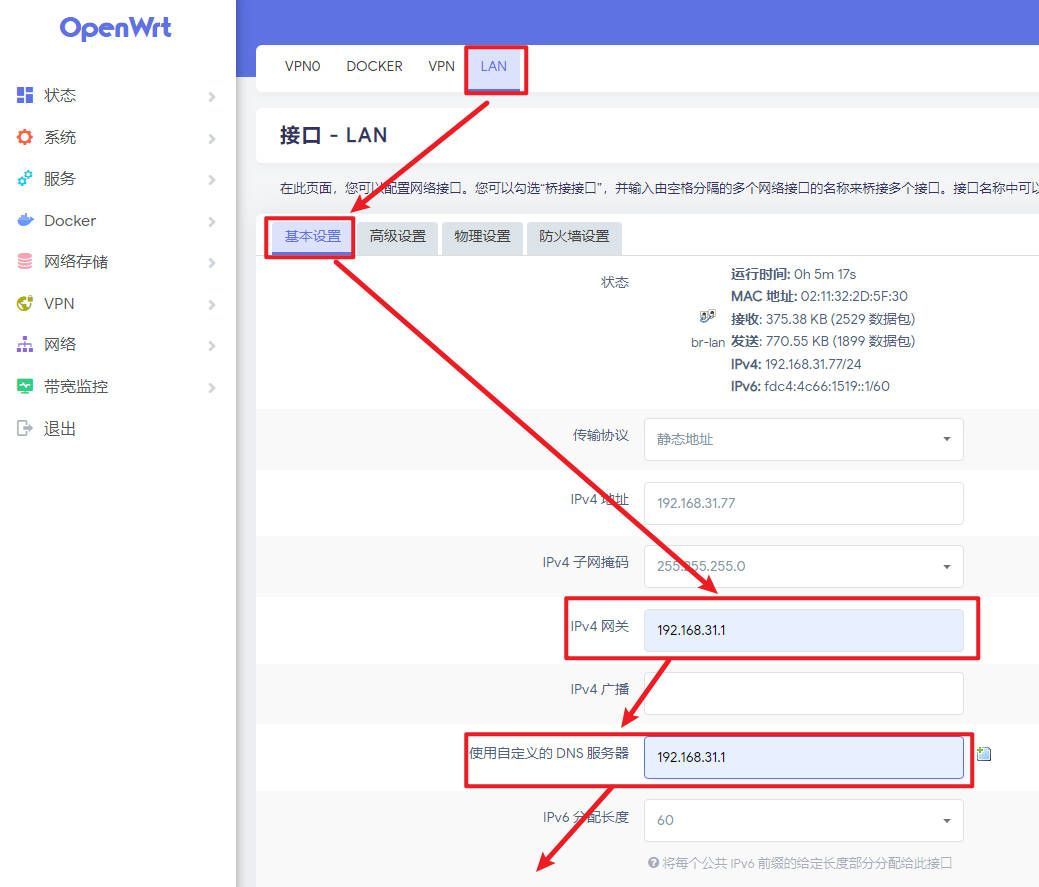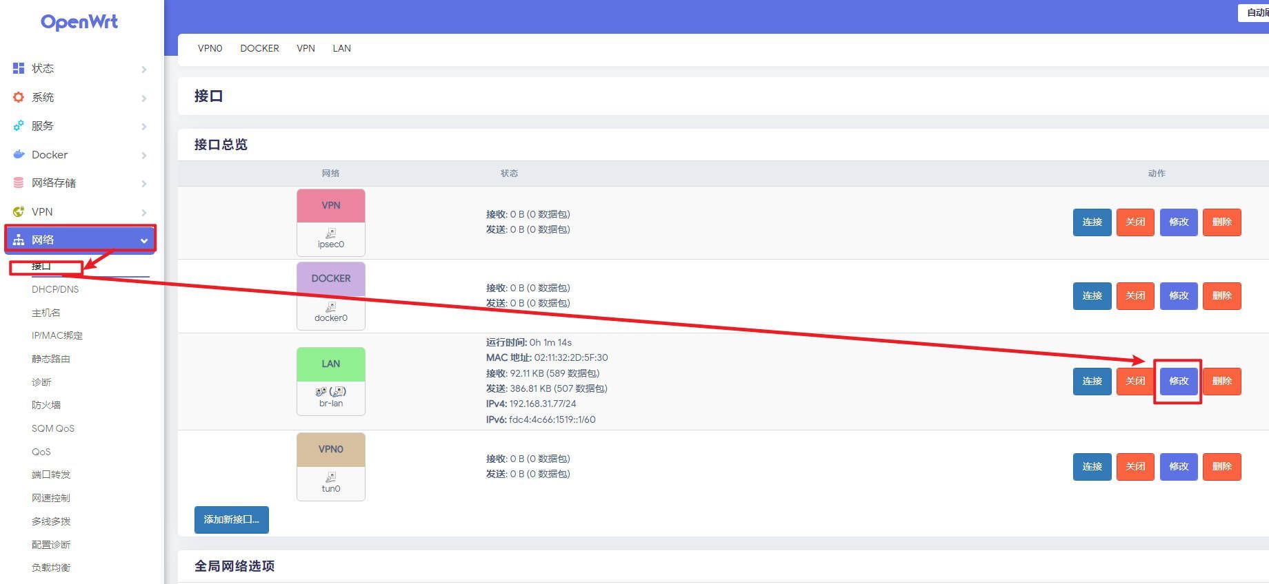 进入管理页面,接下来要进行旁路由的网络设置,点击网络——接口,点击“Lan”后面的修改