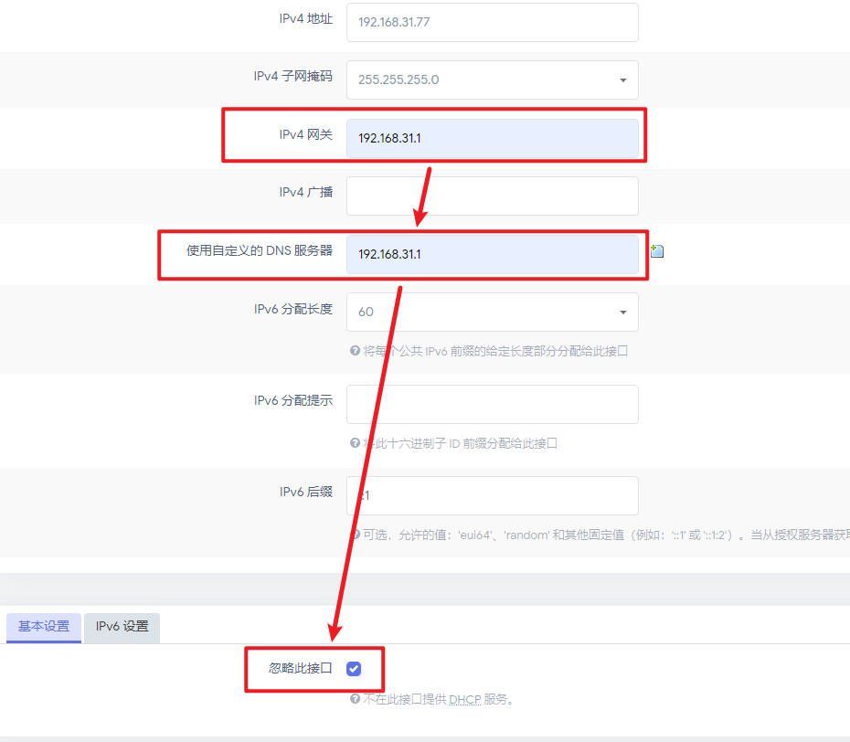 在下方基本设置里选中忽略此接口,点击保存&应用。