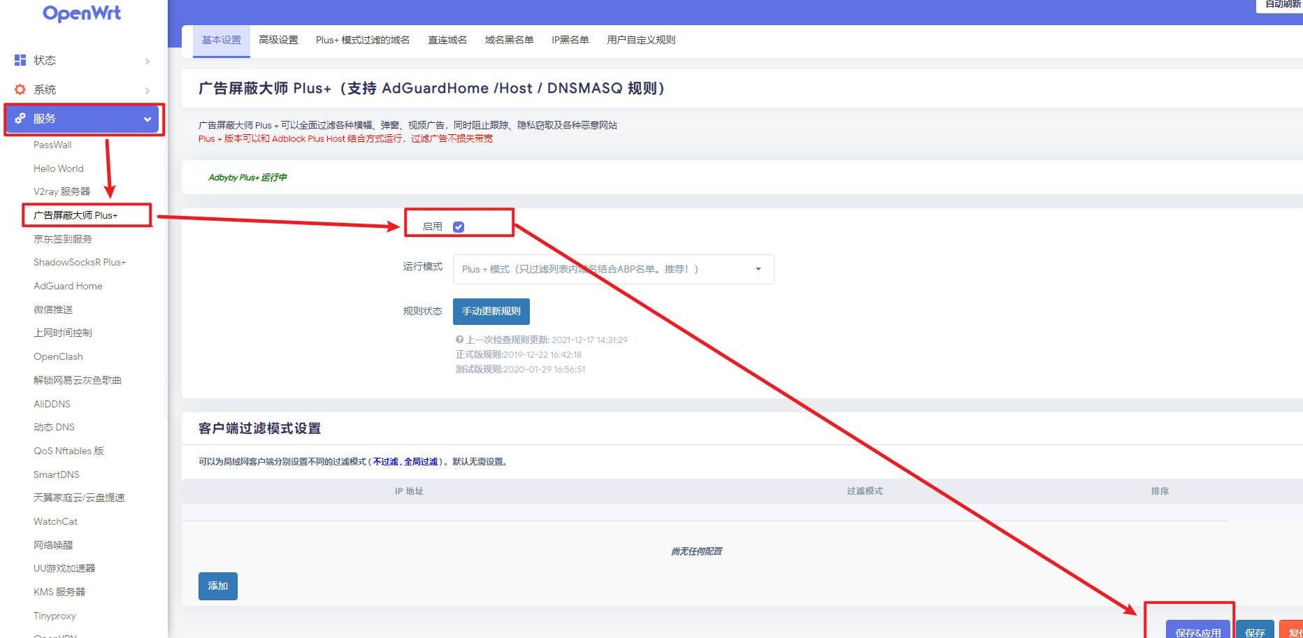 待保存完成后,开始设置广告屏蔽插件,选择服务——广告屏蔽大师——启用——保存&应用