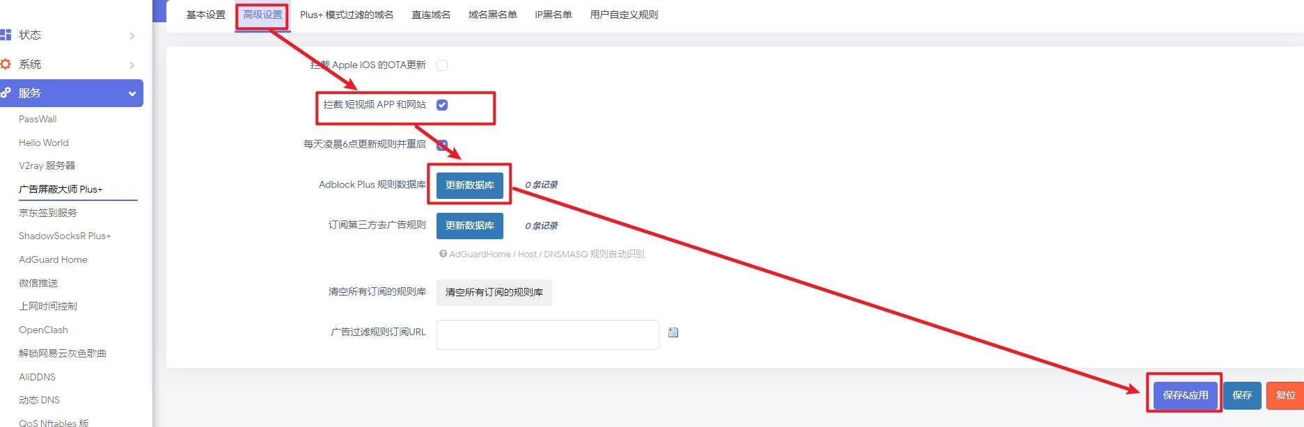 接下来进入高级设置——选择拦截短视频app——点击更新数据库——保存&应用