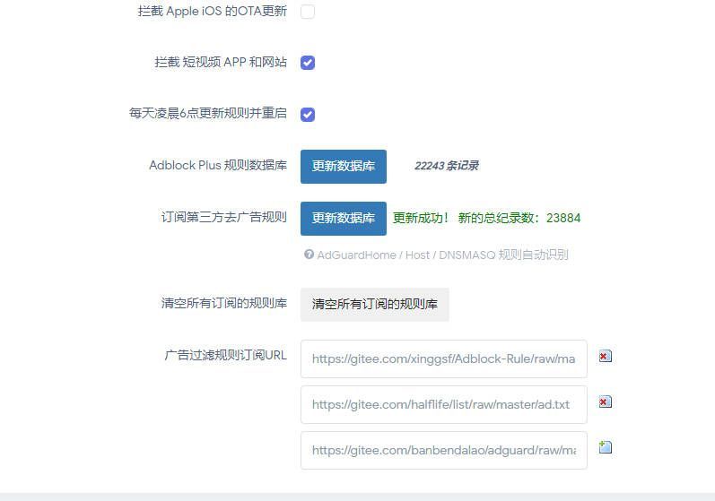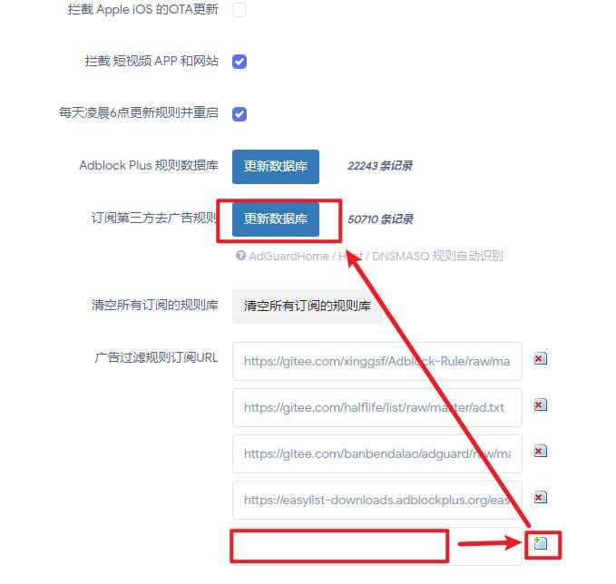 在这里还可以添加第三方广告过滤规则,将我下方提供的网址依次复制进下方空白框中,点击后面的+,保存后再点击更新数据库就可以了