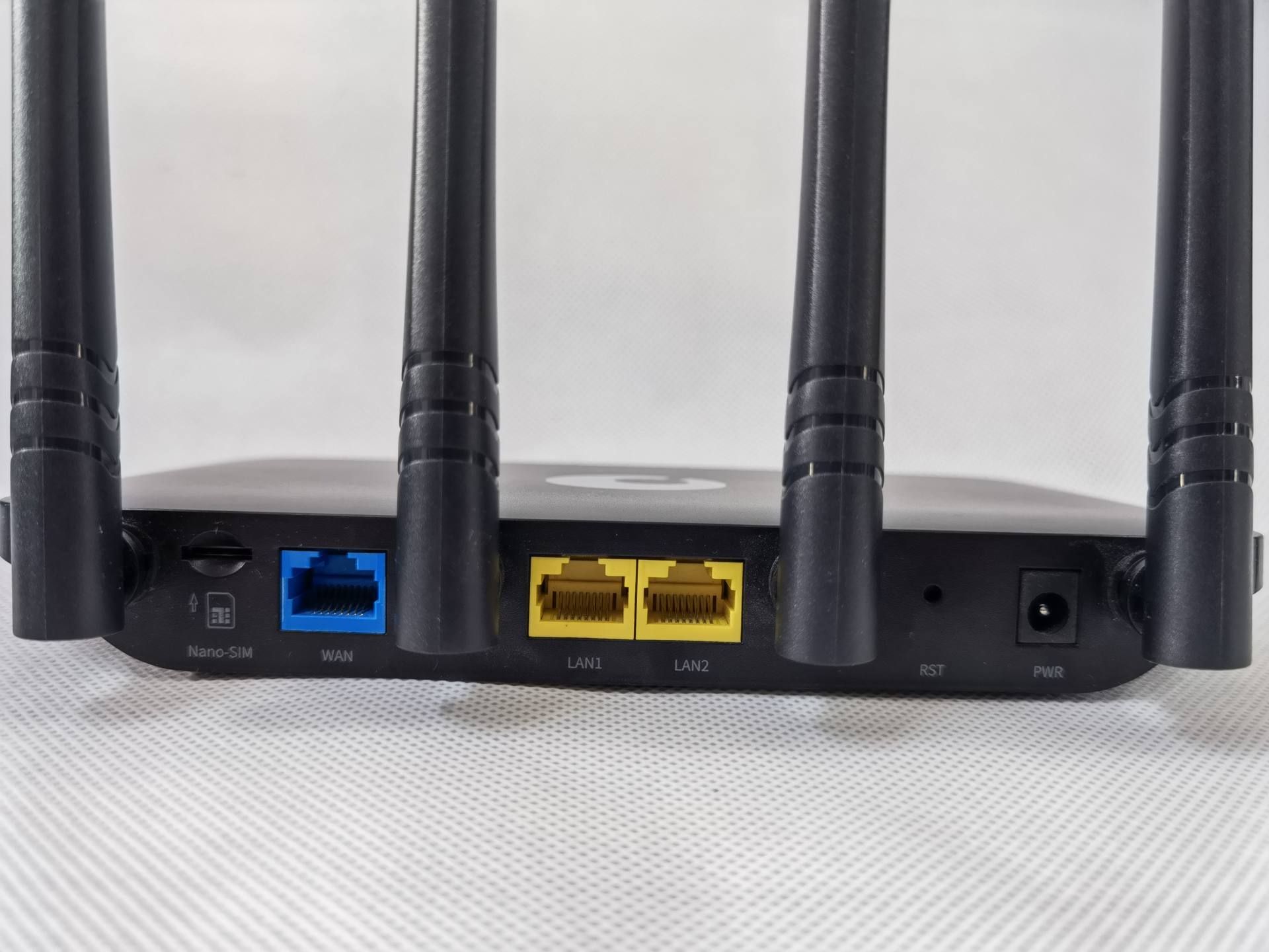 蒲公英X4C的背面除了SIM卡插槽一共有5个端口,从左到右依次为百兆WAN口、2个百兆LAN口、重置键和标准电源接口。蒲公英X4C选用外置天线的设计,四根外置天线分别为2根4G天线、2根2.4G WIFI天线,均匀一字排开,保证信号能够覆盖整个区域。