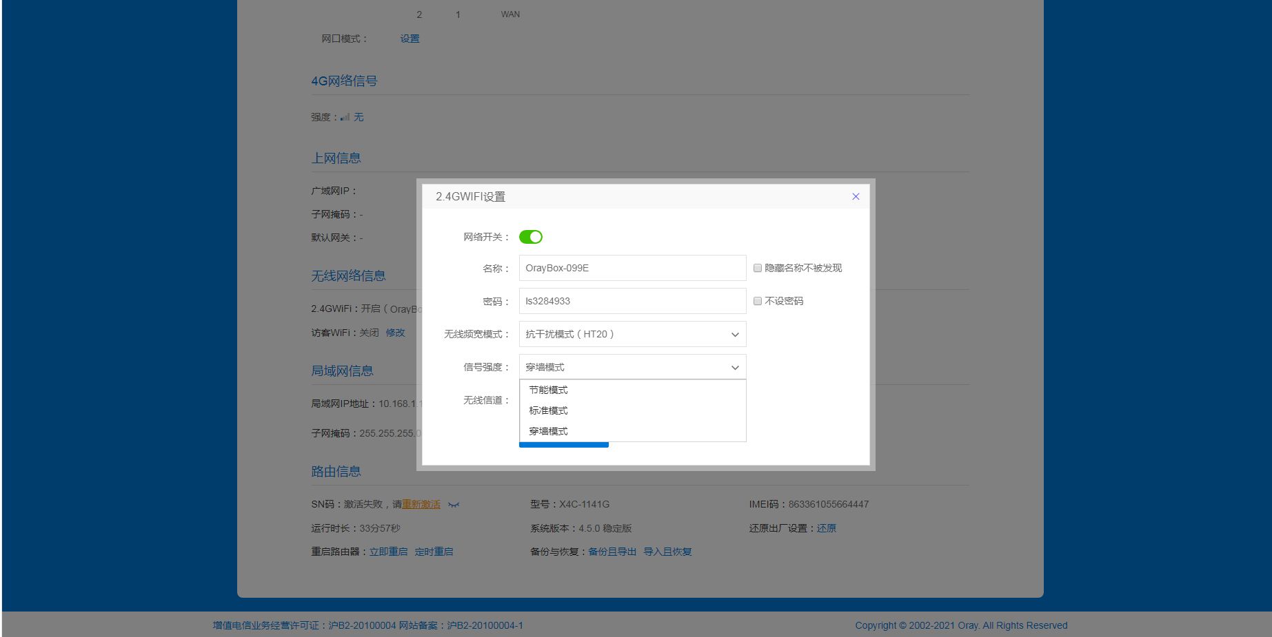 蒲公英X4C的设置可以通过手机和电脑两种方式。这里我给大家示范的是电脑的设置方法,首先电脑要与蒲公英X4C发出的无线信号连接,无线信号的命名一般为“OrayBox-XXXX”;其次,输入网址10.168.1.1,进入蒲公英管理界面;然后在管理界面中,上网方式分为宽带拨号、动态IP、静态IP、APN(4G)、无线中继五种,由于我选用的是4G卡上网,因此在上网方式处我们要选择APN(4G);最后我们在设置管理密码和WIFI密码,点击配置完成即可。另外,在蒲公英管理界面,我们还能够对路由器的信号强度、无线和有线的优先级等方面进行设置。