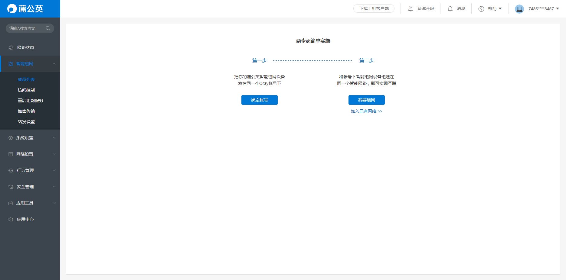 接下来就说蒲公英X4C给我带来的惊喜,那就是它还支持智能组网,并且搭建虚拟局域网的过程很简单。进入蒲公英本地网络管理界面,选择左侧任务栏智能组网中成员列表,然后按照右侧二步走,先注册绑定Oray账号,然后点击我要组网,界面会自动跳转到蒲公英网络管理平台。