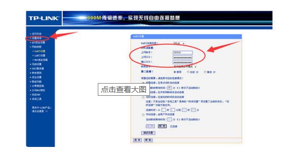 3、在路由器设置界面点击左侧网络参数下的WAN口设置,输入用户所在的的宽带账号和密码,点击保存。