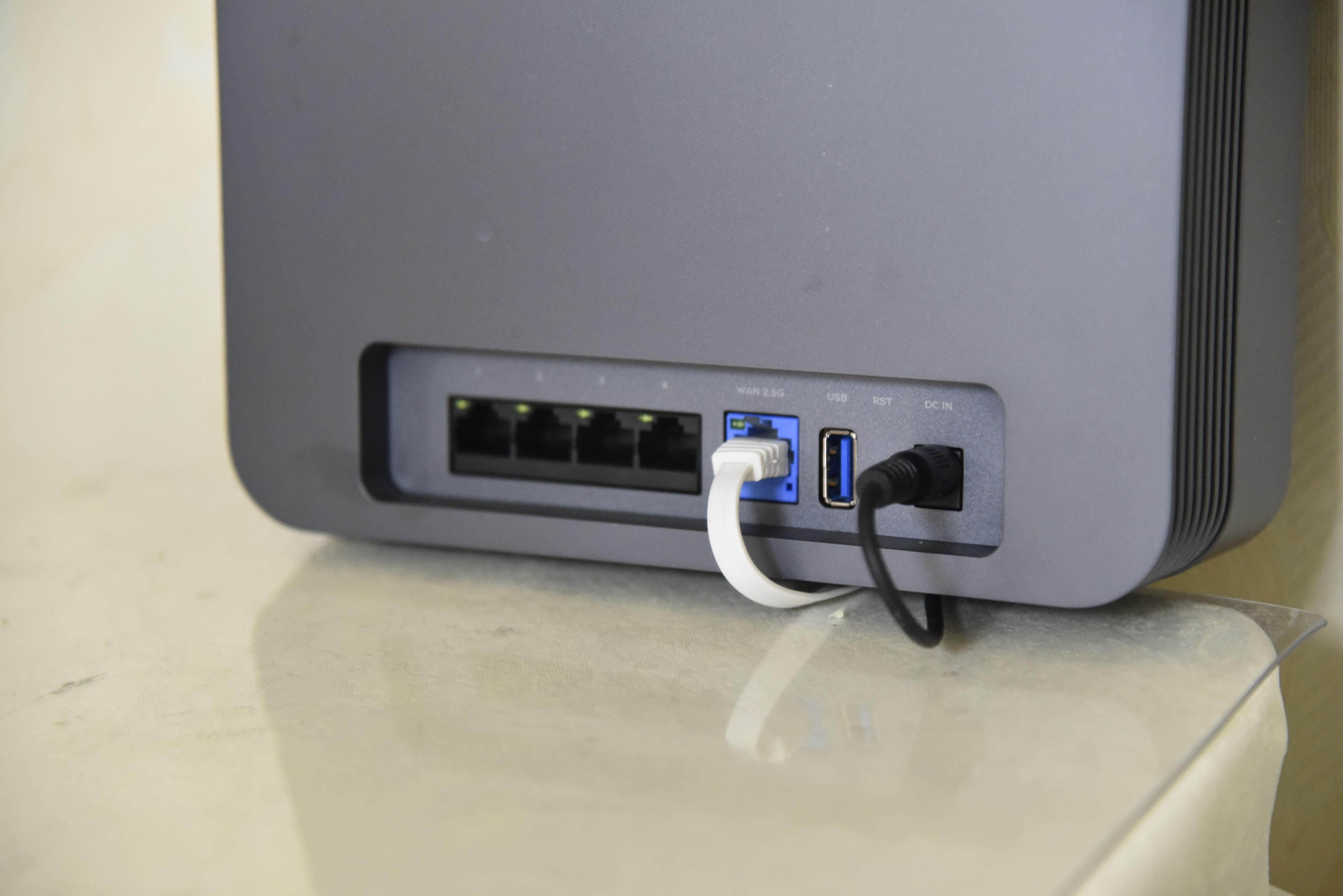 前面的下部是IO接口区,四个千兆LAN口,一个2.5G WAN口,一个USB 3.0、一个电源插口。有些遗憾的事,就是这个2.5G口无法切换成LAN口。