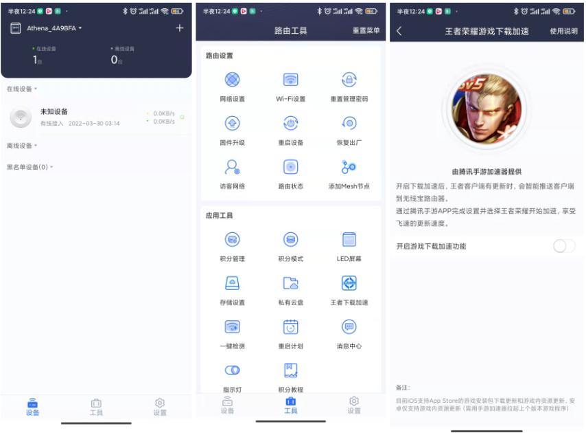 通过APP可以看到雅典娜的功能还是很强大的,一般路由器有的都有。另外还有网盘功能,它内置128G eMMC存储,还能通过USB 3.0外接移动硬盘来扩展存储空间。不过,它的网盘目前还不支持离线下线,但有一个王者荣耀下载功能。这个功能很有意思,可以提前下载《王者荣耀》的更新包,让我们在玩王者荣耀时可以更快地更新。