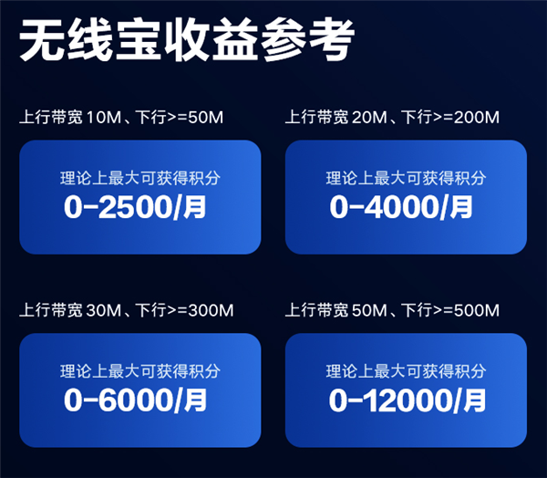 雅典娜的收益怎么样?官方根据宽带大小作出了收益参考。我家是联通1000M,那么理论上最高可能拿到12000积分,就是约120元的等值收益。是不是很香?