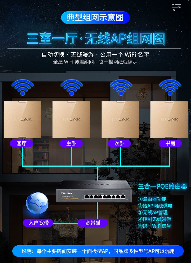 墙面上都有网络插座,把这个插座拆掉,换成AP面板网络插座。把旧路由器扔掉,换成POE交换机。