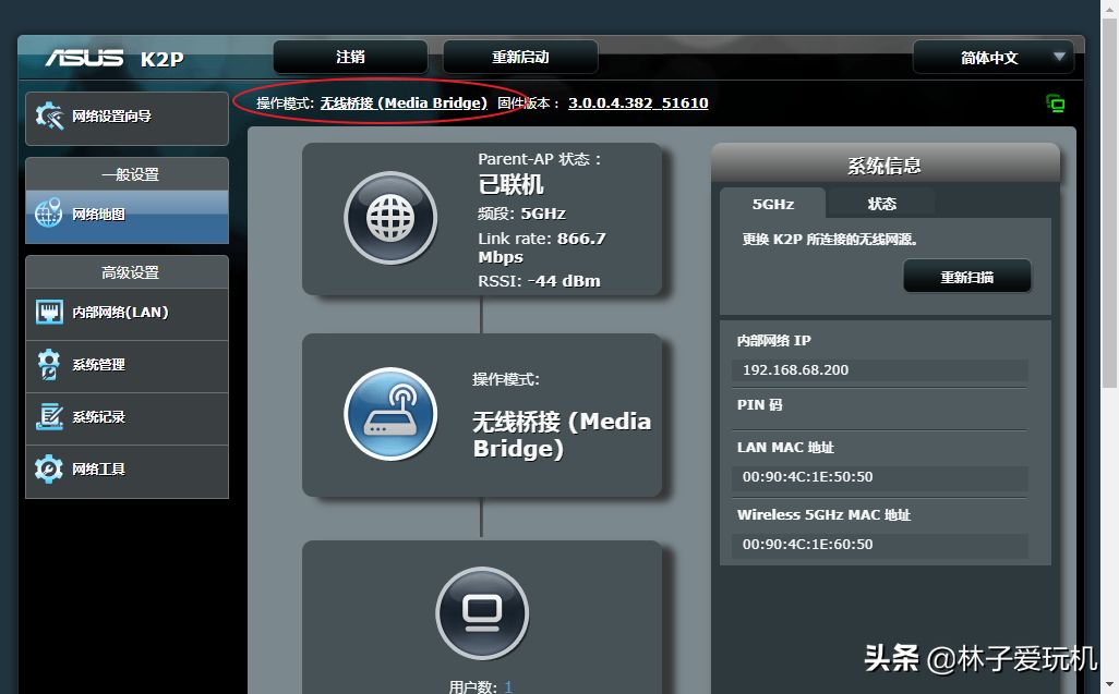 路由器器操作模式也已经发生了变化,变成了无线桥接(Media Bridge)模式。