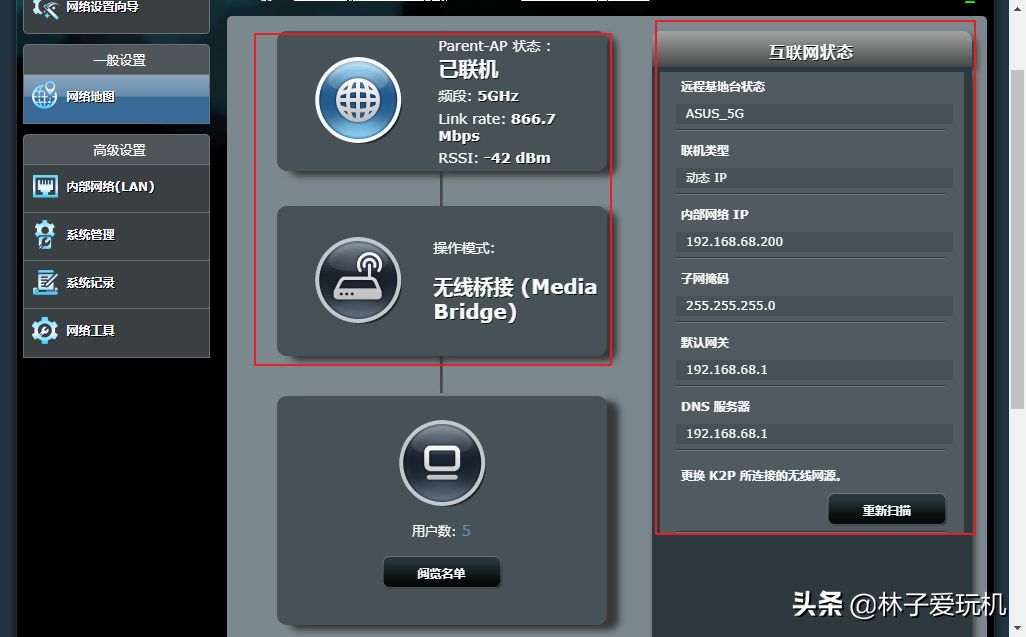 网络地图也已经发生了相应的变化,先看看最上面的变成了Parent_AP,频段为5G频段,link rate(连接速率):866.5mbps,RSSI(信号强度)-43dbm,信号强度为-43dbm,重要说明这里信号强度必须低于-70dbm,这个参数非常重要,因为会直接影响到上网速率。在右侧互联网状态信息中,显示了桥接WiFi信号的相关信息。