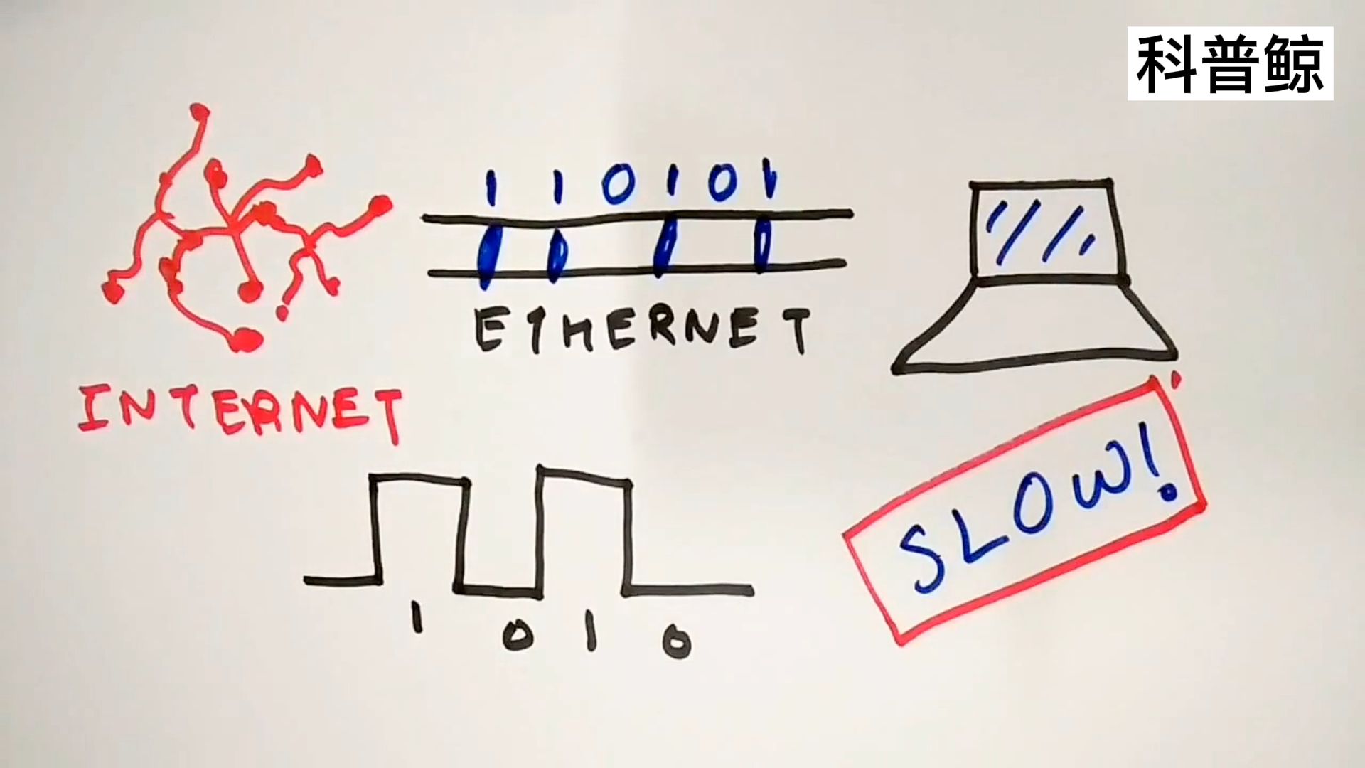 在wifi出现之前,人们通过以太网连接互联网,以太网是有线连接,使用电脉冲将二进制数据传输到计算机,二进制指的是计算机语言,由高脉冲一,和低脉冲零组成,因为电线中电子存在电阻,所以以太网显然速度很慢。