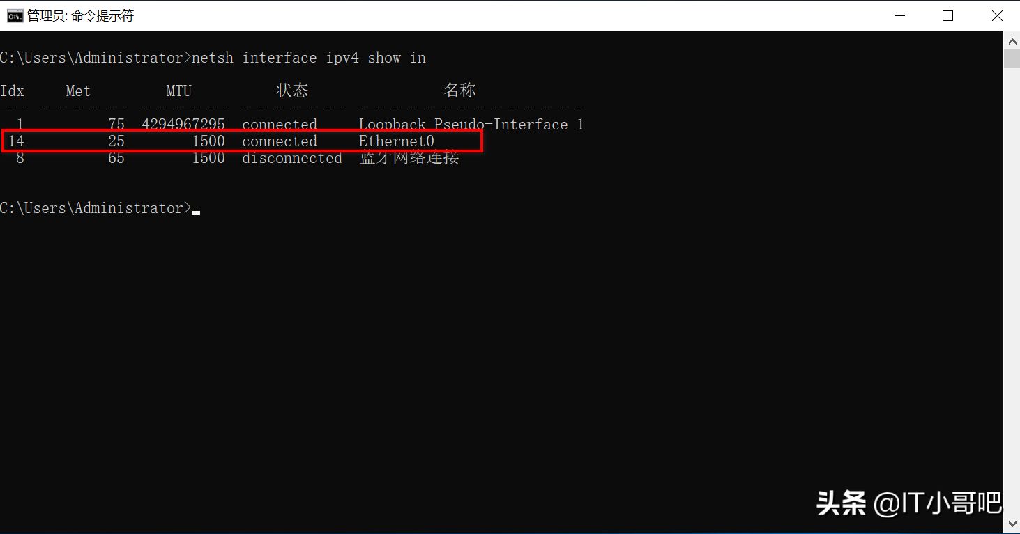 - 输入命令:netsh interface ipv4 show in,在Idx列中看到本地网卡的值为14。这个数值要记住,因为arp静态永久绑定路由的时候需要用到。