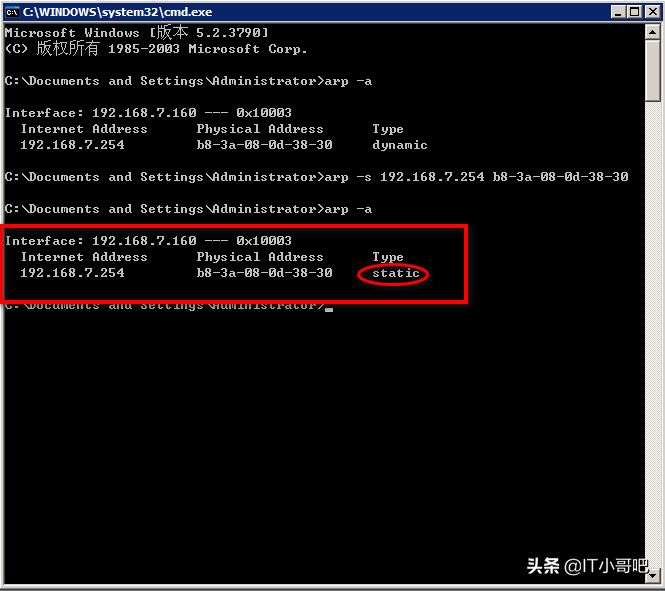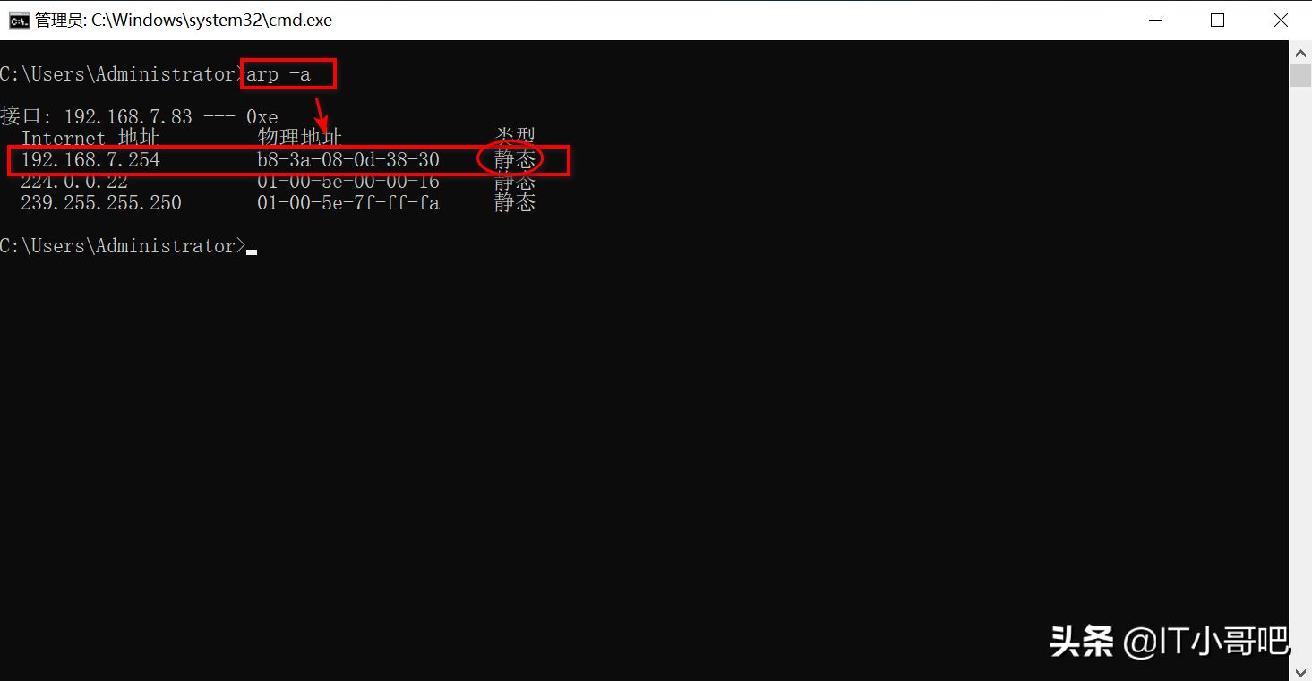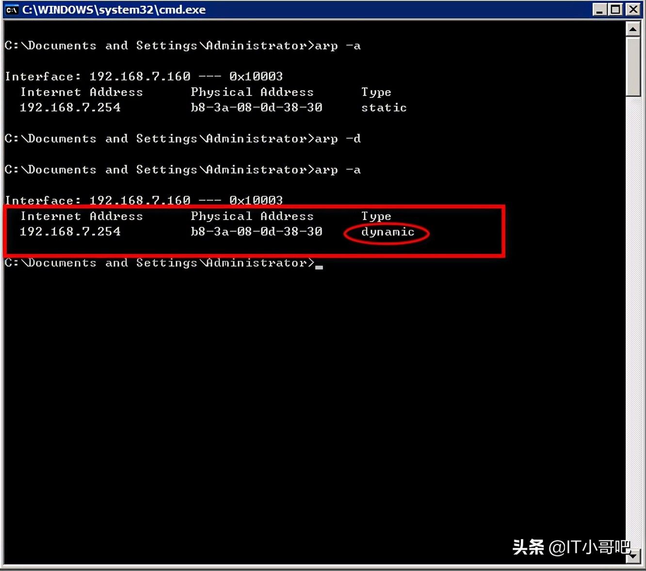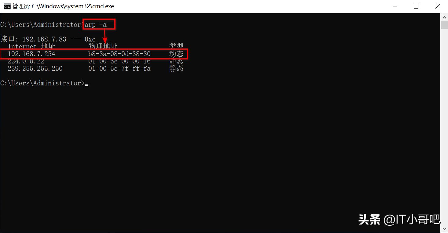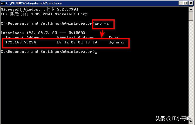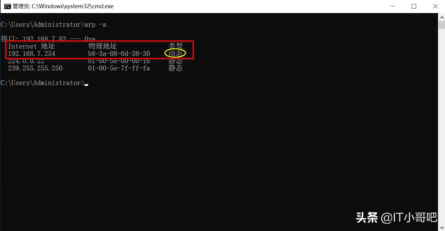 我们通过输入命令arp -a查看下,发现Type为dynamic那么证明解除绑定成功。