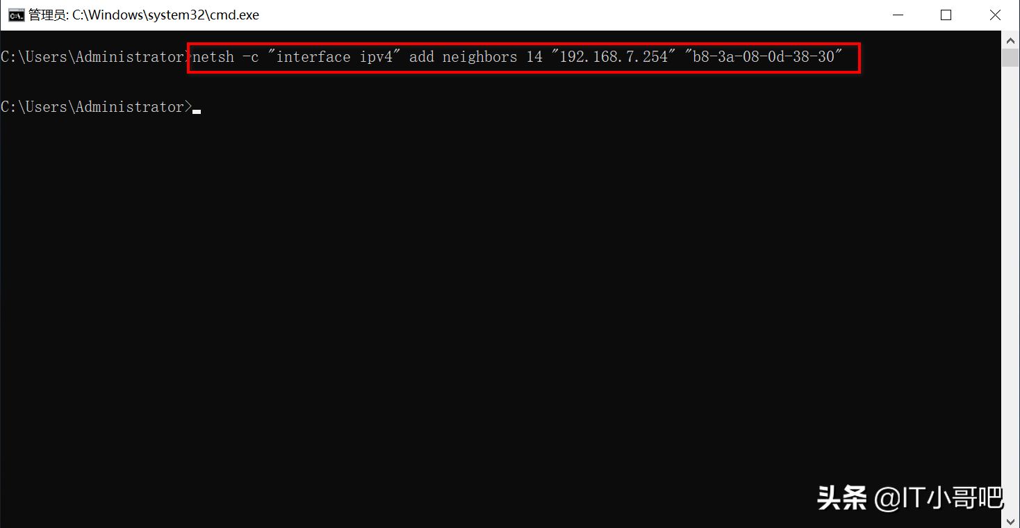 命令格式:netsh -c "interface ipv4" add neighbors idx "路由器IP地址" "路由器MAC地址"