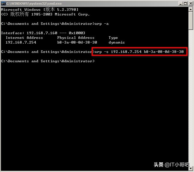 命令格式:arp -s 路由器IP地址 路由器MAC地址