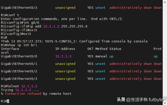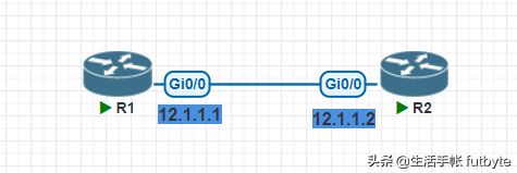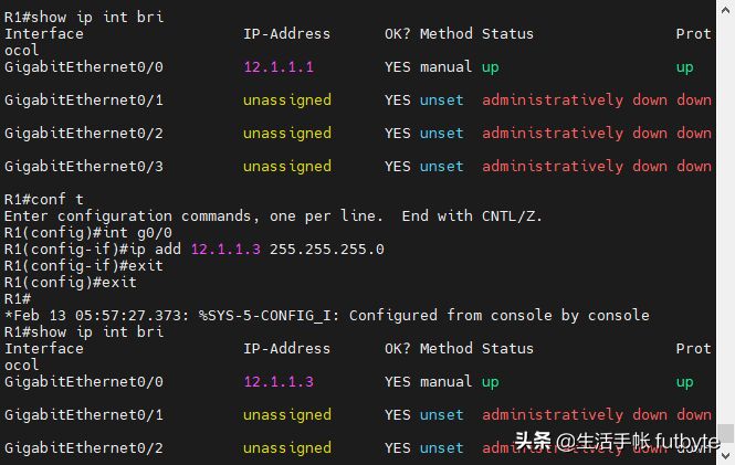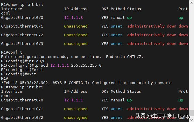 R1(config-if)#ip add 12.1.1.3 255.255.255.0 //配置接口G0/0 ip地址