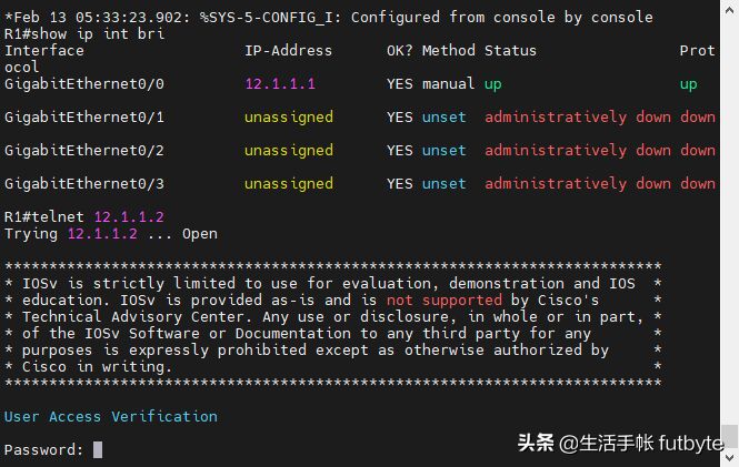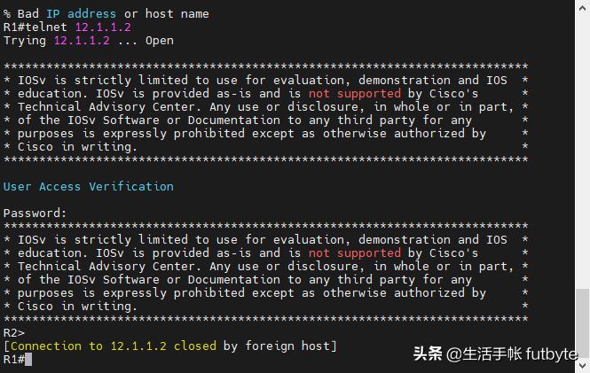 R1#telnet 12.1.1.2 // 远程连接12.1.1.2