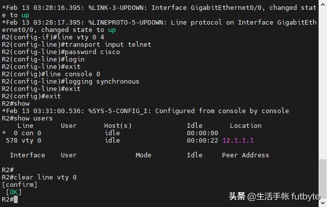 R2#clear line vty 0 // 断开远程登录的用户 也可使用 clear line 578