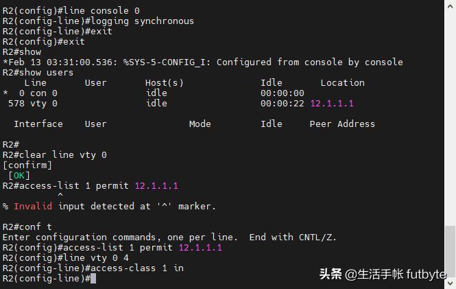 R2(config-line)#access-class 1 in // 允许符合access-list 1的信息进入