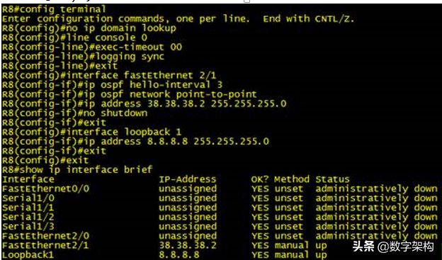 以R3为例,设置hello包发送频率为3秒一个,将area 5的接口类型更改为point-to-point,当然需要将相直连的另一个接口也要更改,即R8上的快速以太接口也要更改为同样的接口类型,即point-to-point(接口模式下)