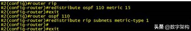 全网分别启用了OSPF、RIP协议,现在实施重发布,实现全网互通,实验要求所有OSPF协议学习到外部网络的开销为真实开销。则在重发布RIP协议时,需要更改metric-type为1