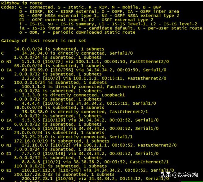 注:IA 在OSPF自制系统中除当前路由器所在区域外其他区域的路由条目
