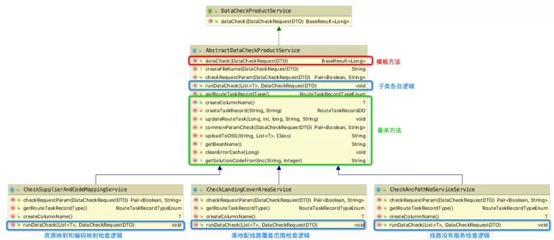 dataCheck方法为模板方法,runDataCheck方法由各个子类去实现,其他方法是基本方法。还有一些其他方法,是各个检查工具都需要使用的,所以就放在了父类中。
