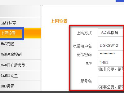 3、然后找到上网设置选项卡,根据电信运营商所提供的上网方式、“账号”和“密码”进行设置,以实现自动拨号。